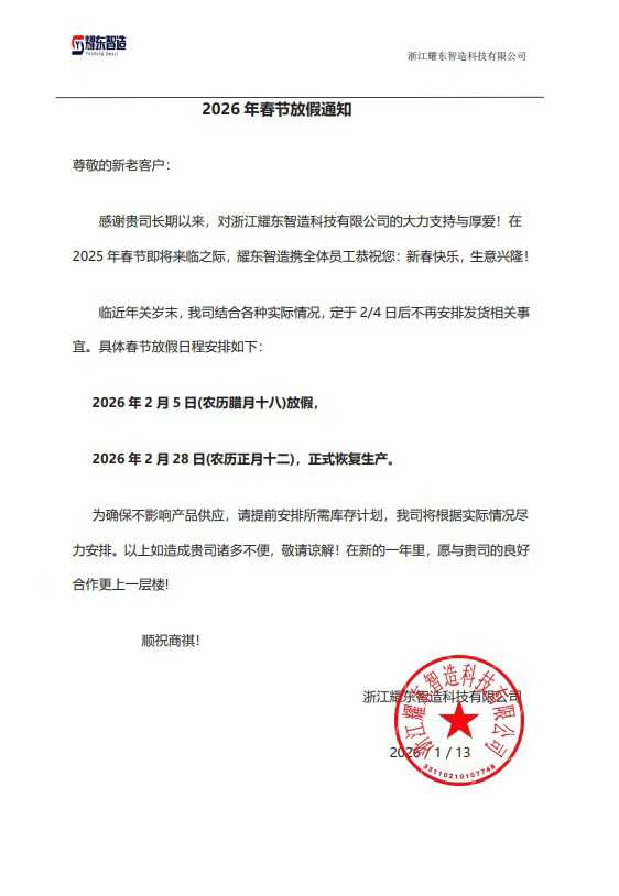 ตามประกาศ เพื่อให้มั่นใจในคุณภาพของผลิตภัณฑ์และการจัดส่งคำสั่งซื้อก่อนวันหยุดอย่างเป็นระเบียบ สายการผลิตของ Zhejiang Yaodong Smart Manufacturing จะปิดตัวลงอย่างสมบูรณ์ตั้งแต่วันที่ 5 กุมภาพันธ์ 2025 ขณะเดียวกัน การจัดส่งด้านลอจิสติกส์ก็จะถูกระงับในช่วงวันหยุดเทศกาลฤดูใบไม้ผลิด้วย บริษัทขอแนะนำให้ลูกค้าใหม่และลูกค้าปัจจุบันที่มีสินค้าคงคลังหรือข้อกำหนดคำสั่งซื้ออย่างเร่งด่วน เพื่อคว้าโอกาสสุดท้ายและดำเนินการคำสั่งซื้อและการยืนยันให้เสร็จสิ้นโดยเร็วที่สุด สิ่งนี้จะช่วยให้บริษัทสามารถจัดการทรัพยากรได้อย่างมีประสิทธิภาพ และรับประกันการส่งมอบผลิตภัณฑ์ชุดสุดท้ายอย่างทันท่วงทีและมีคุณภาพก่อนวันหยุด
